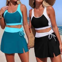 Women's Contrast Trim Sporty Swimwear - Tennis Style Crop Top & High Waisted Side Tie Swim Skirt Set