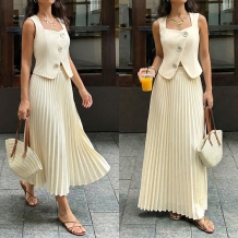 Elegant Two-Piece Set: Asymmetric Button Vest Top & Pleated Maxi Skirt