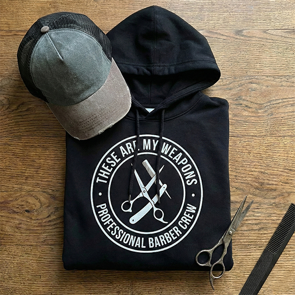 Barber Hoodie for Men & Women - "These Are My Weapons" Pullover - Funny Hairstylist & Barber Shop Crew Sweatshirt - Scissors Razor Graphic Gift