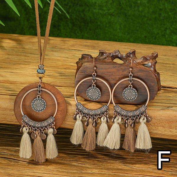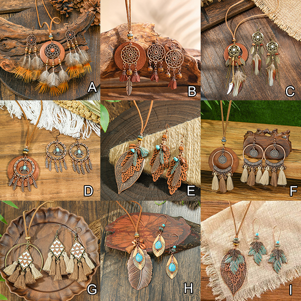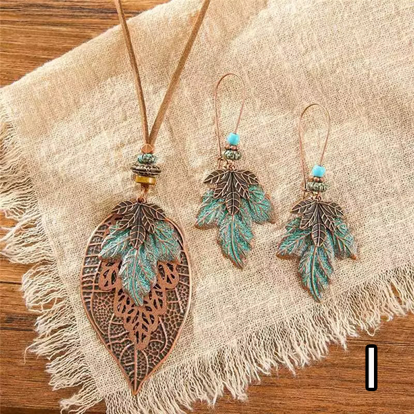 Boho-chic Tassel/Leaf Pendant Jewelry Set incl Neckline and Drop Earrings