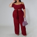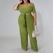 Casual Plus-size Solid Color Two-piece Set Consists of Short Sleeve Open-shoulder Shirt and Wide-leg Pants