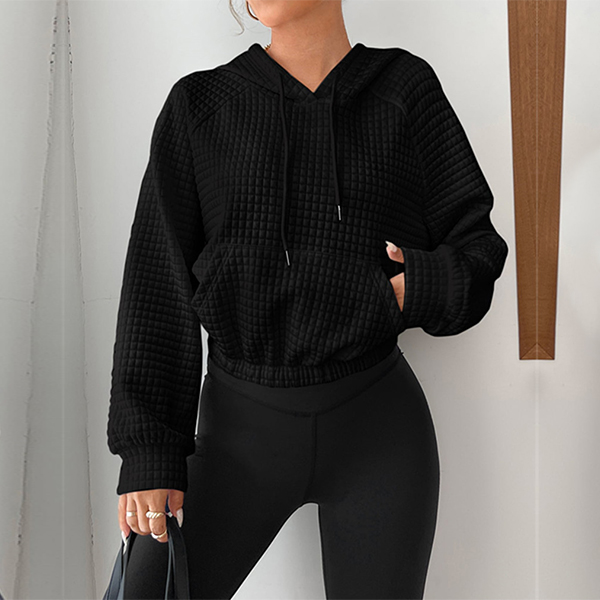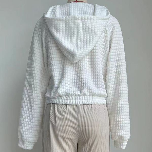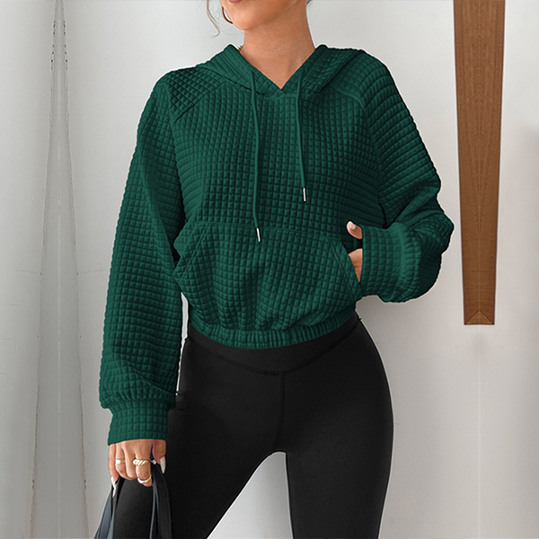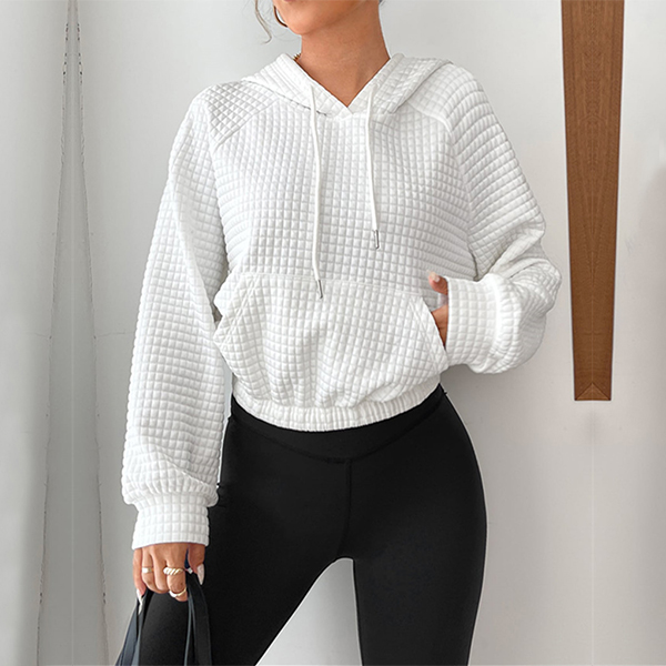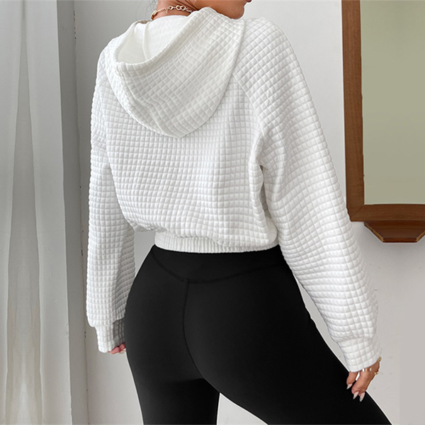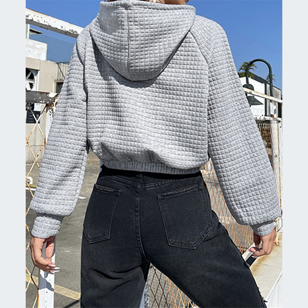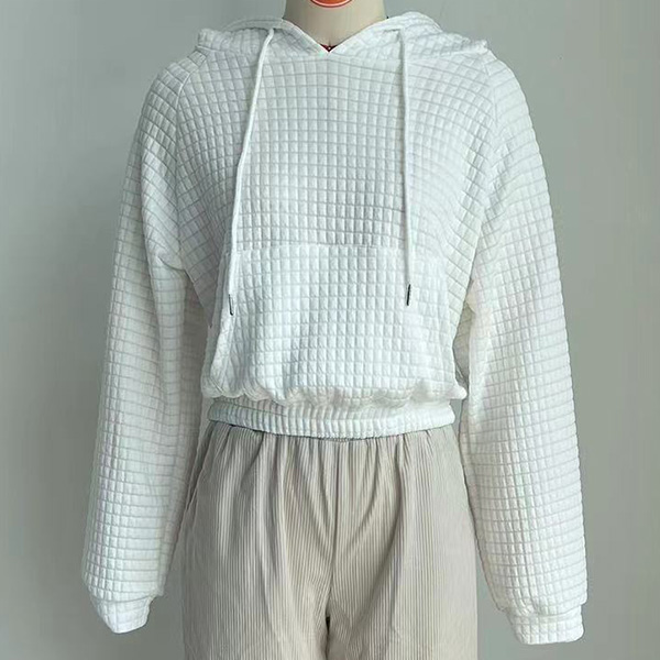 Casual Solid Color Long Sleeve Drawstring Hooded Waffle Texture Crop Sweatshirt
