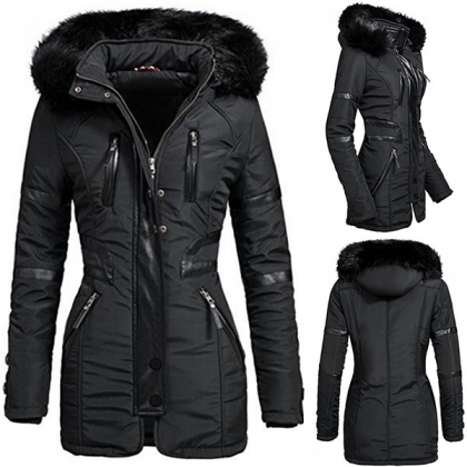 the faux fur spliced hooded silhouette design can keep you warm and comfy all day,and the fit