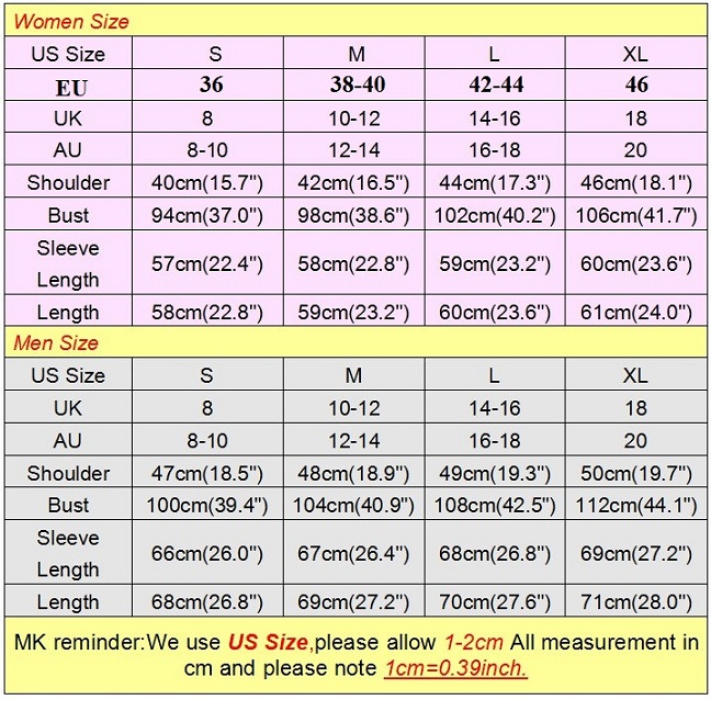 XL : Bust : 106cm(41.73"); Shoulder : 46cm(18.11"); Sleeve : 60cm(23.62"); Length : 61cm(24.02");