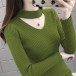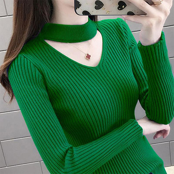 Fashion Solid Color Long Sleeve Choker V-neck Knit Top