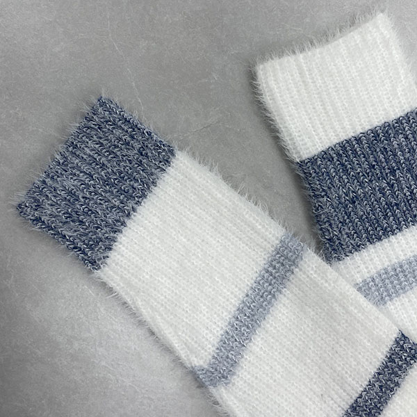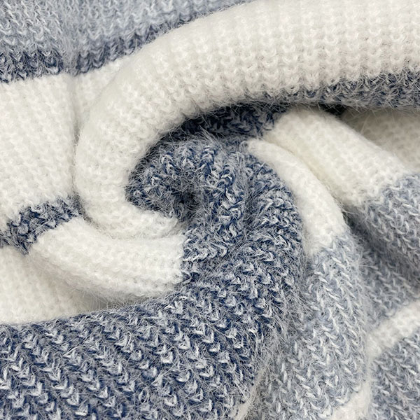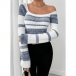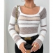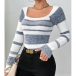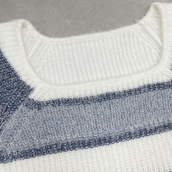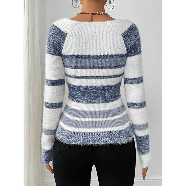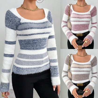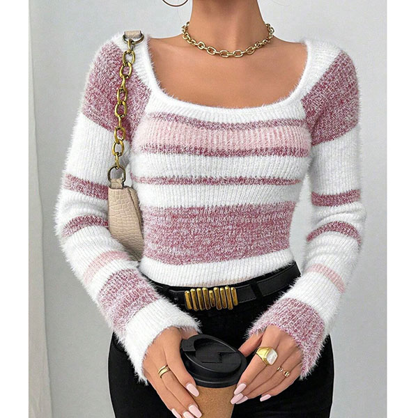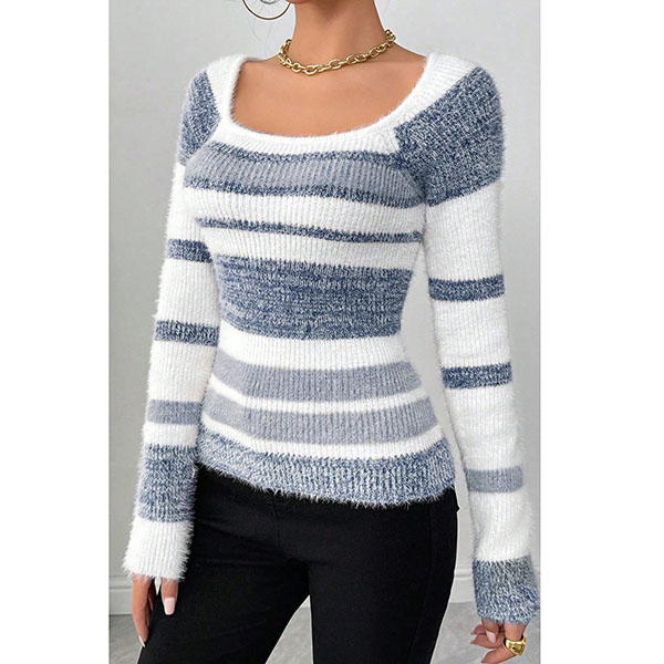 Contrasting Color Striped Sweater with Square Collar in Knitted Design