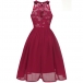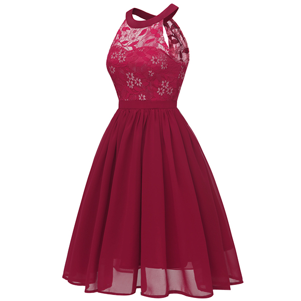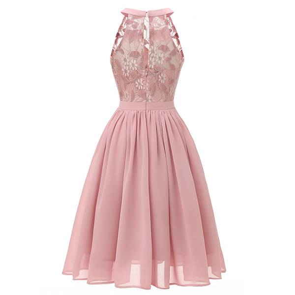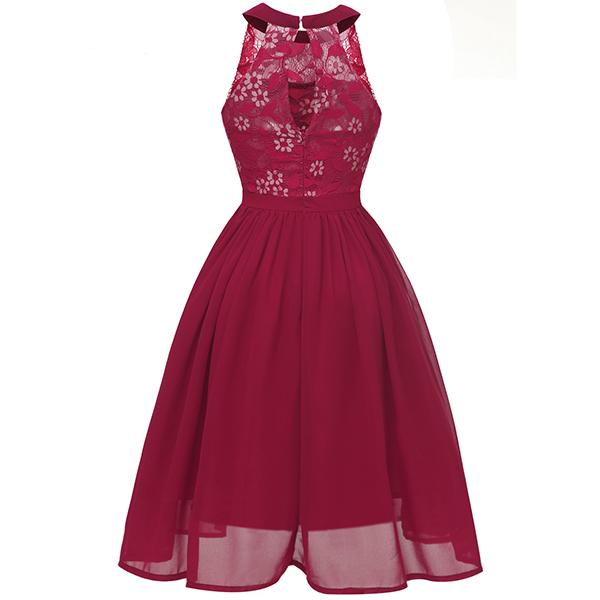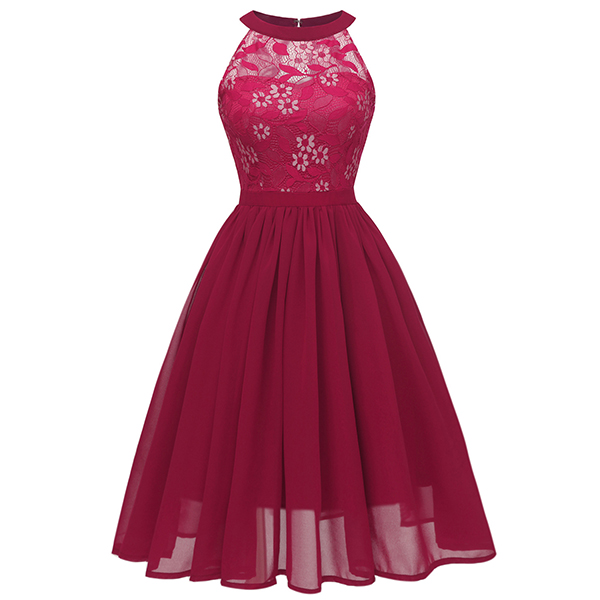 This is a beautiful and elegant mini dress that is perfect for any special occasion. The dress is made from a high quality and comfortable material, and it features a sleeveless design, a lace spliced bodice, and a pleated skirt. This dress is sure to make you look and feel your best.