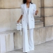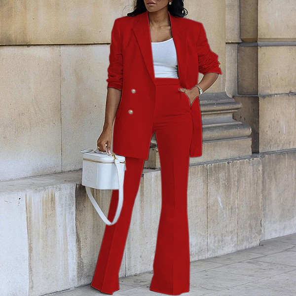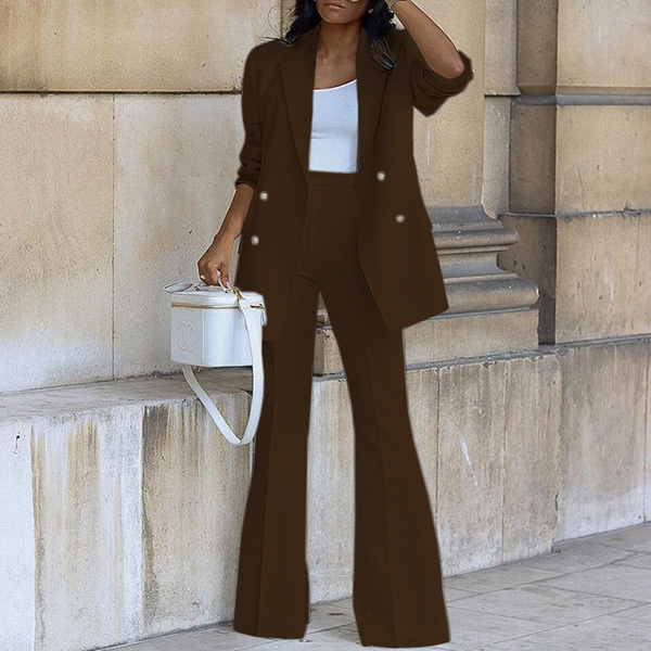 This Elegant Solid Color Suit Set is perfect for any formal occasion. It includes a double-breasted lapel blazer and wide-leg pants.