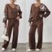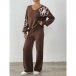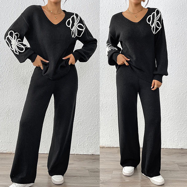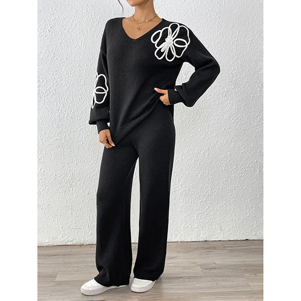 Embroidered Two-Piece Set with V-Neck Sweater and Straight Pants