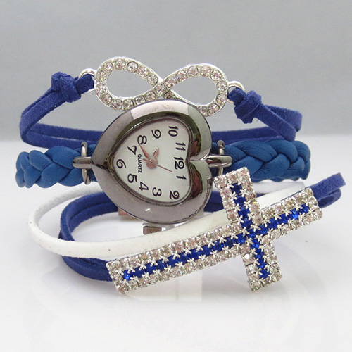 Fashion Rhinestone Cross Heart-shaped Dial Woven Bracelet Watch