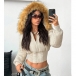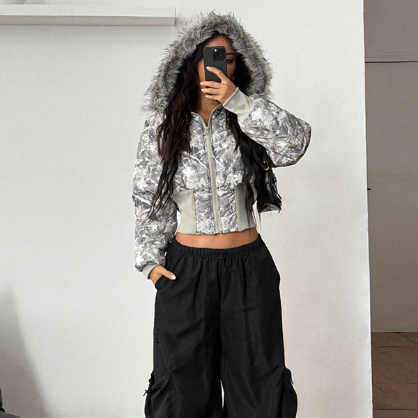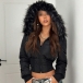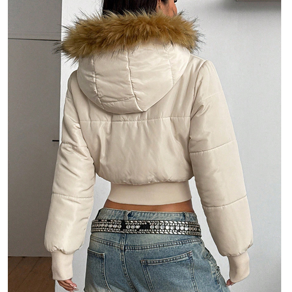 Fashion Artificial Fur Spliced Hooded Long Sleeve Quilted Crop Jacket