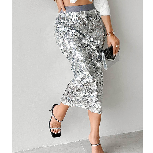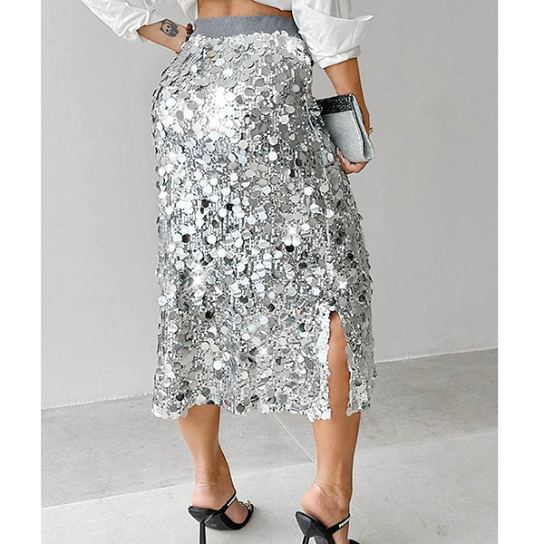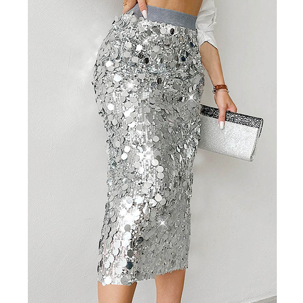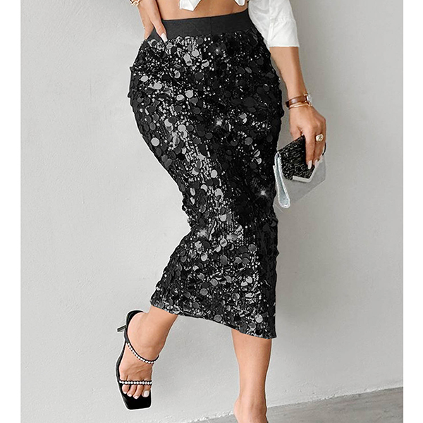 This glamorous piece combines classic silhouette sophistication with dazzling embellishment for show-stopping occasion wear. The sequin construction provides light-catching brilliance and textural richness that transforms simple pencil skirt styling into statement glamour through comprehensive sparkle application, while the high-rise waistline creates flattering proportion and vintage-inspired elegance that enhances the silhouette. The side slit introduces movement and contemporary edge that breaks the classic pencil construction with functional appeal, Perfect for evening celebrations, holiday styling, special occasions, or anytime you want classic silhouettes with maximum glamour impact and sophisticated embellishment appeal.