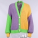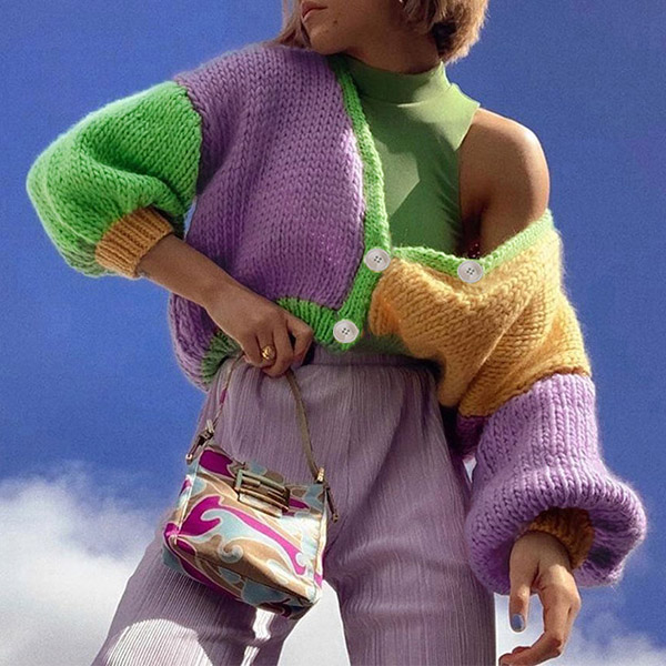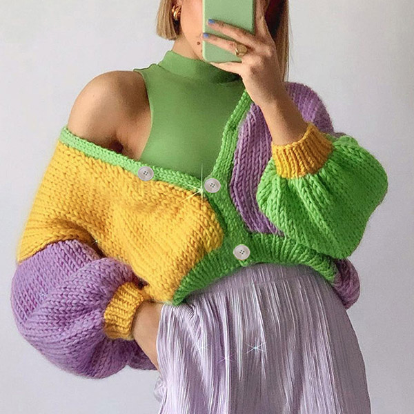 Fashion Contrast Color Lantern Sleeve V-neck Loose Knit Cardigan