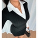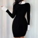 Fashion Contrast Color Polo V-neck Long Sleeve Bodycon Ribbed Dress