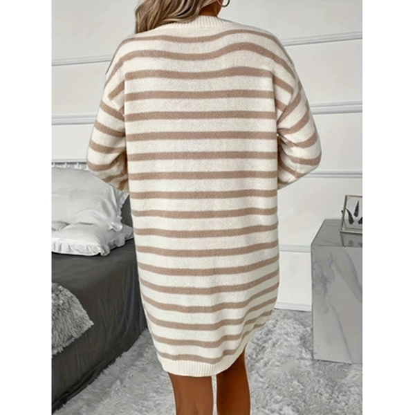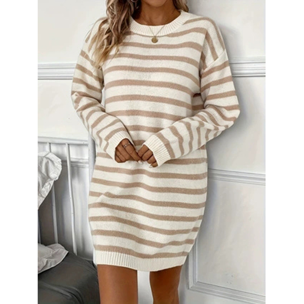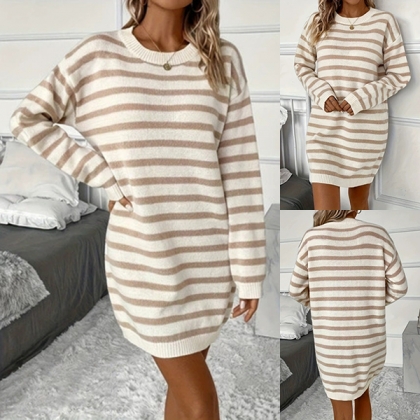Fashion Contrast Color Stripe Printed Crew Neck Long Sleeve Sweater Dress