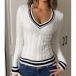 Fashion Contrast Color Stripe V-neck Long Sleeve Cable Knitted Sweater