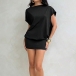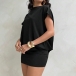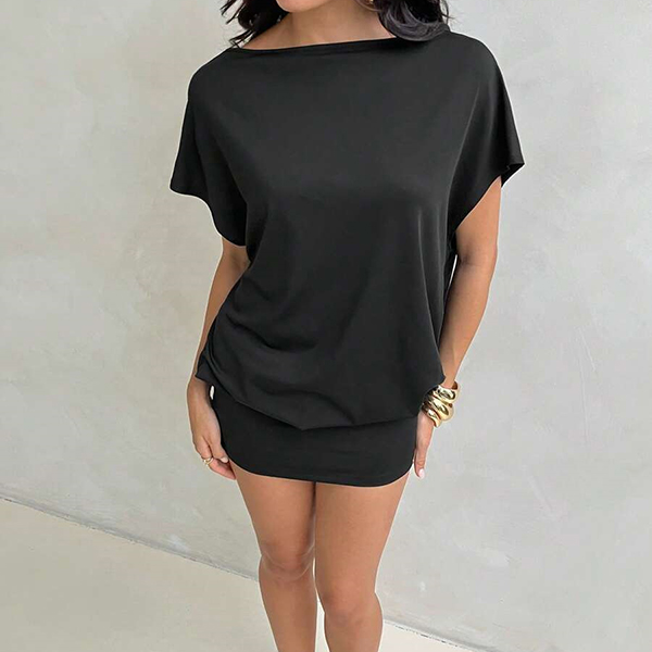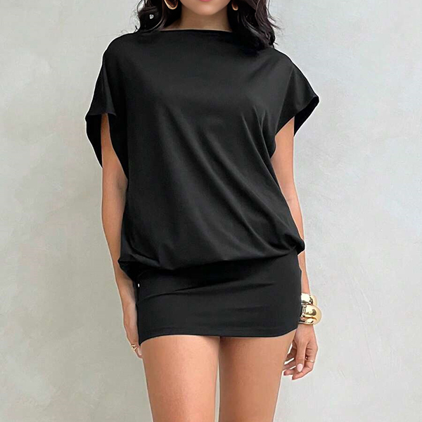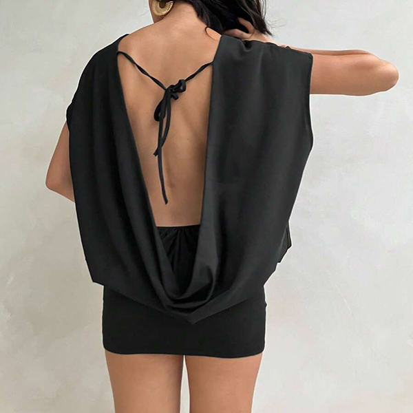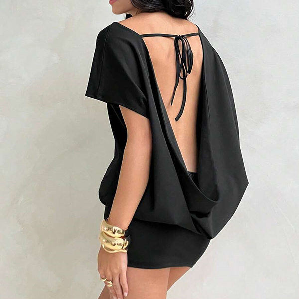This black dress features contemporary fashion styling with classic crew neck construction and dramatic draped backless design for modern elegant sophistication. Perfect for summer vacation.