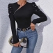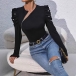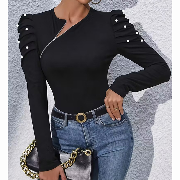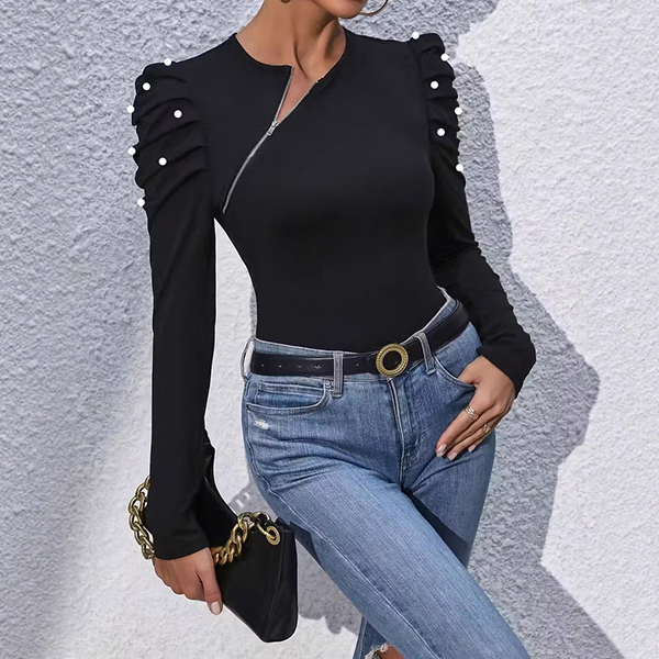 Fashion Crew Neck Slant Zipper Puff Long Sleeve Bead Shirt