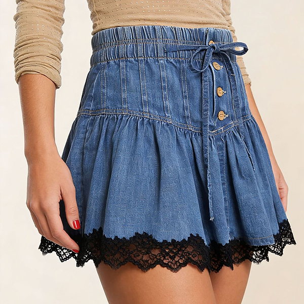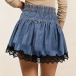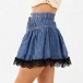 Fashion Drawstring Waist Front Button Smocked Waist Lace Spliced Hemline Denim Skirt