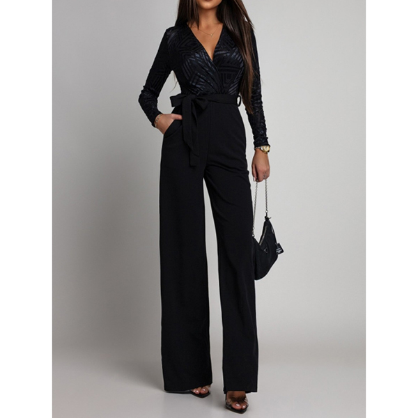 Fashion Floral Jacquard V-neck Long Sleeve Self-tie Straight-cut Jumpsuit