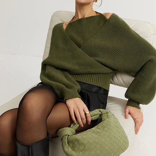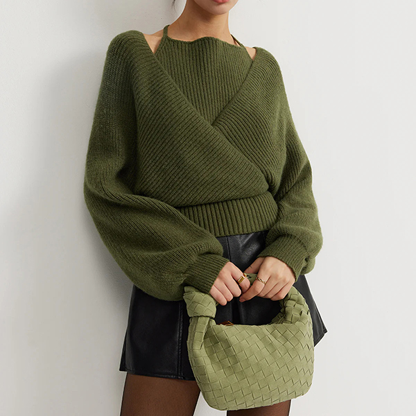 This sophisticated sweater features striking halter neck styling with dramatic batwing construction and innovative mock two-piece design for contemporary layered elegance.Wanna have a try?