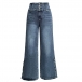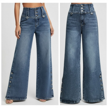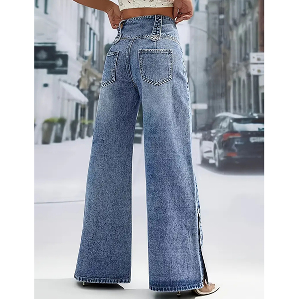 Fashion High-rise Button Fly Side Button Slit Wide-leg Old-washed Denim Jeans