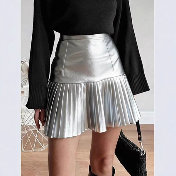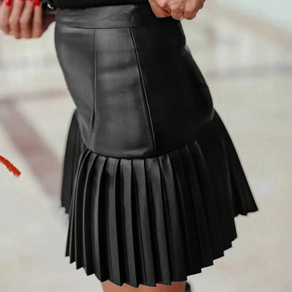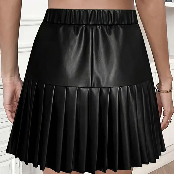 Fashion High-rise Pleated Hemline Artificial Leather PU Skirt