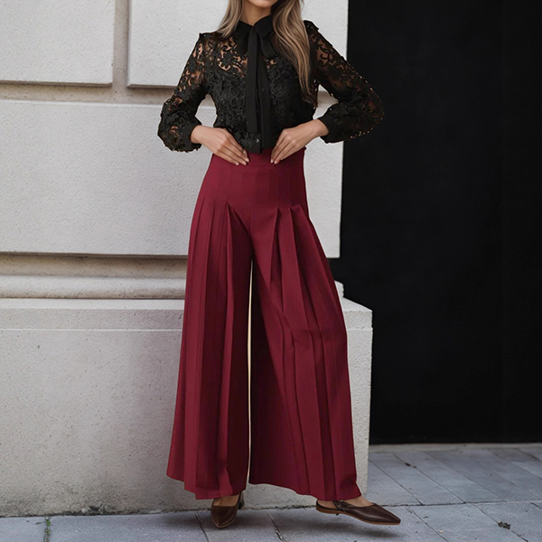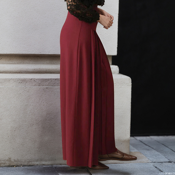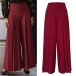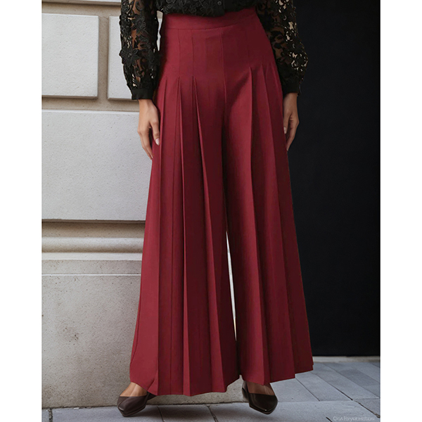These red pants feature flattering high-rise waistline with elegant pleated detailing and flowing wide-leg silhouette for modern sophisticated elegance. Pair with fitted tops and heels for contemporary elegant appeal.