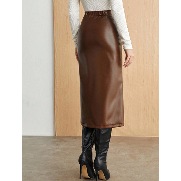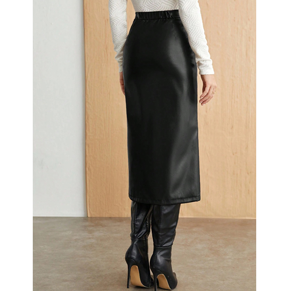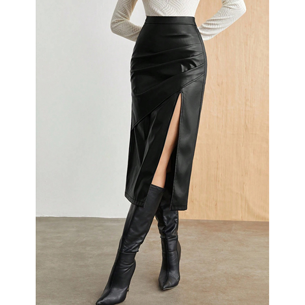 This midi skirt features edgy artificial leather construction with sophisticated ruched detailing and dramatic side slit for modern elegance. Perfect for evening occasions, cocktail events, or edgy sophisticated wear. Pair with fitted tops and heels for evening sophistication.