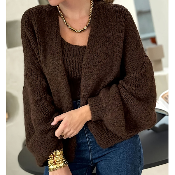 This elegant two-piece set features coordinated knitted cami top and matching cardigan for versatile layered sophistication. The knitted construction brings textural appeal whilst the matching pieces create cohesive styling with coordinated elegance. Hope you like it.