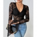 Fashion Lace Corset Bodysuit - Scalloped V-Neck & Flare Sleeves