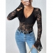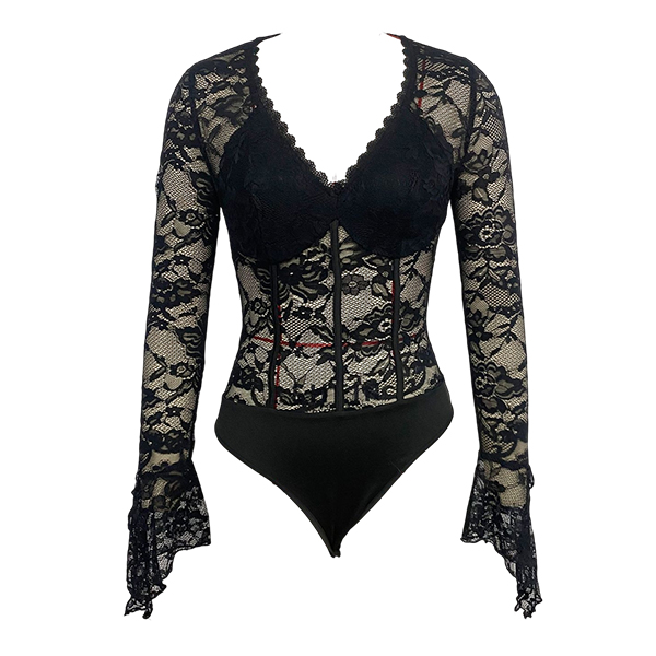This black bodysuit features elegant fashion styling with luxurious lace construction and structured corset design for contemporary romantic sophistication. Pair with high-rise bottom for fashion daily look!