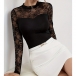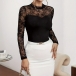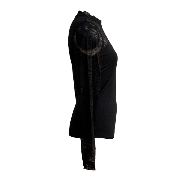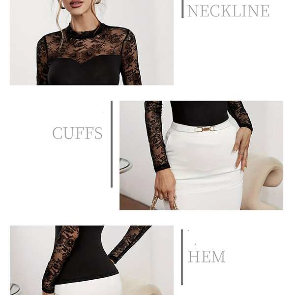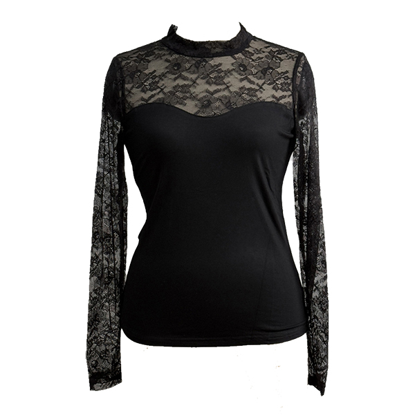 This black shirt features classic crew neck styling with romantic lace spliced detailing and comfortable long sleeves for contemporary feminine elegance. Pair with tailored bottoms and flats for sophisticated casual appeal.