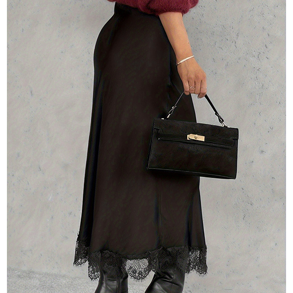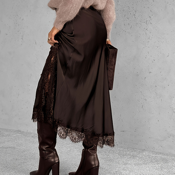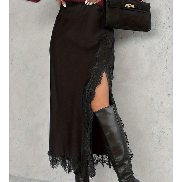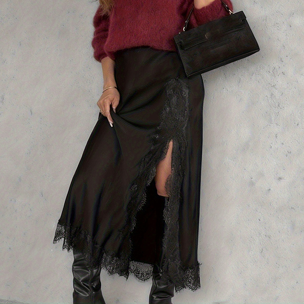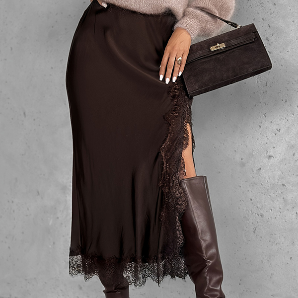 Look at this skirt! Delicate lace splicing adds luxurious texture and artisanal charm, creating beautiful visual interest and elevated appeal. A strategic side slit introduces subtle allure and graceful movement, allowing you to walk with confidence and ease. Wanna have one?