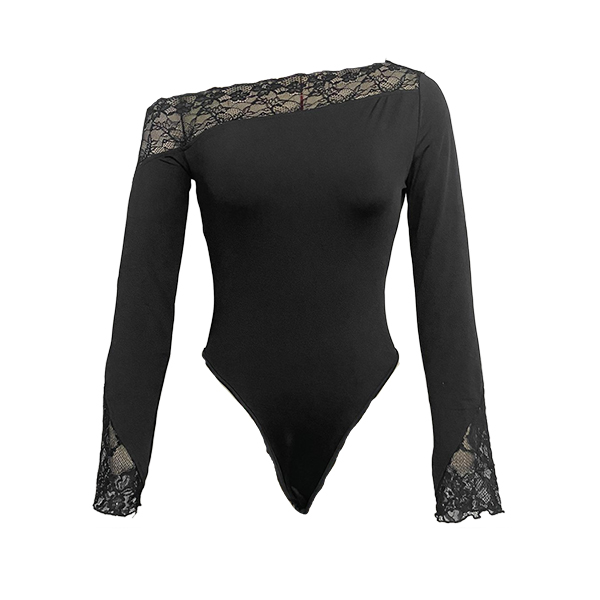 This elegant bodysuit features delicate lace splicing with contemporary slant shoulder styling for sophisticated femininity. The asymmetrical shoulder design creates dramatic neckline appeal whilst the lace detailing adds romantic texture and luxurious charm. Pair with high-waisted skirts and heels for evening elegance, or style with jeans and ankle boots for casual romantic sophistication.
