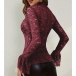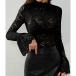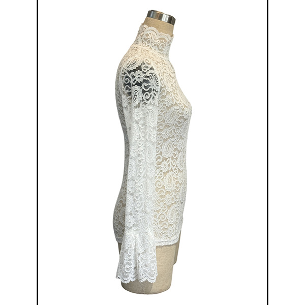 This elegant shirt features sophisticated mock neck styling with dramatic trumpet sleeves and delicate semi-through lace construction for contemporary romantic sophistication. Pair with fitted bottoms and heels for contemporary elegant appeal.