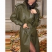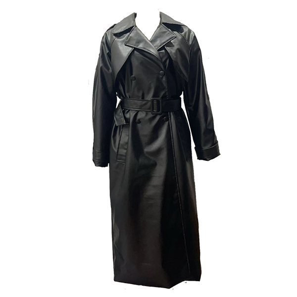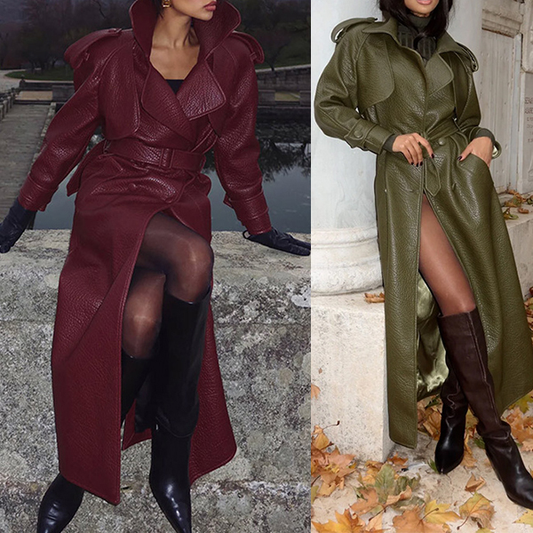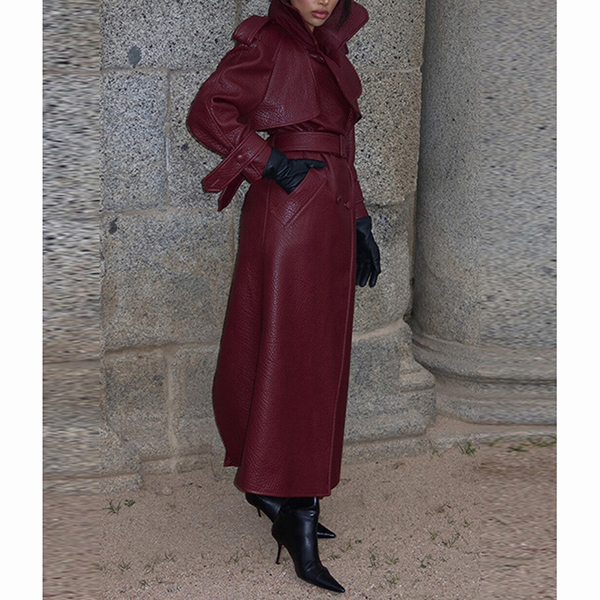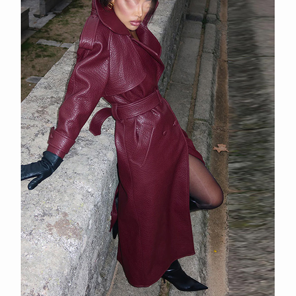 Fashion Notch Lapel Long Sleeve Double-breasted Artificial Leather PU Jacket with Belt