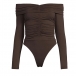 This alluring bodysuit features romantic off-the-shoulder styling with figure-flattering ruched construction and long sleeve design for contemporary sophisticated elegance. Pair with high-waisted bottoms and heels for contemporary elegant appeal.