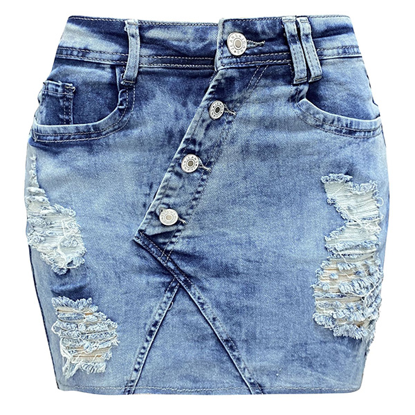 This is a trendy and edgy skirt that combines an old-washed denim fabric, distressed detailing, irregular button accents for a fashionable and unique look.