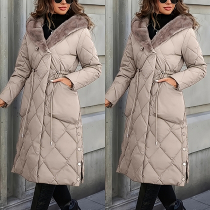 Fashion Plush Lined Long Sleeve Drawstring Waist Side Button Quilted Longline Coat