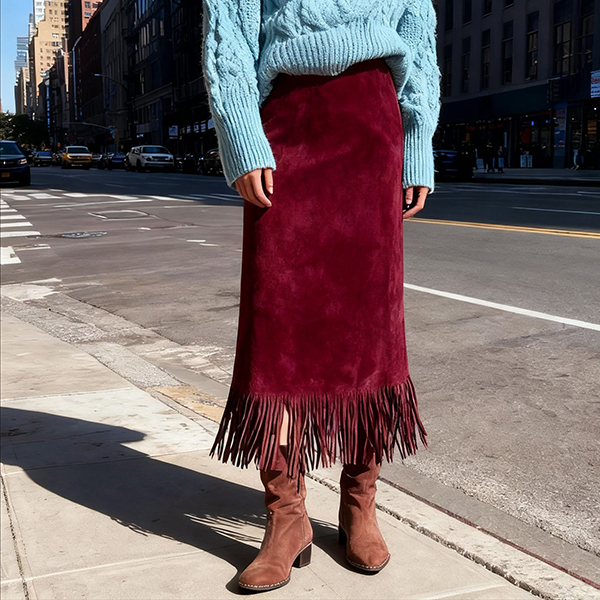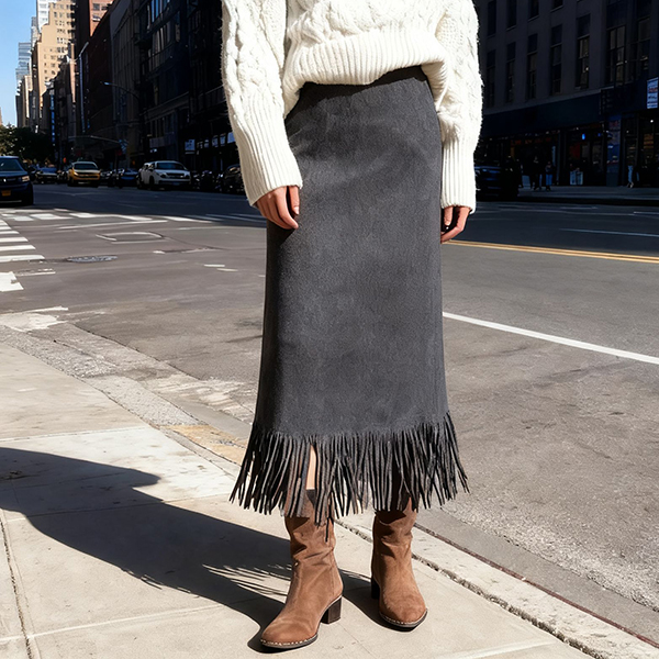 This elegant skirt combines classic silhouette with luxurious textures for sophisticated femininity. The suede material provides rich tactile appeal with soft luxurious finish that elevates everyday styling, while the tassel hemline adds playful movement detail that softens the structured fit. Perfect for daily wear.