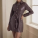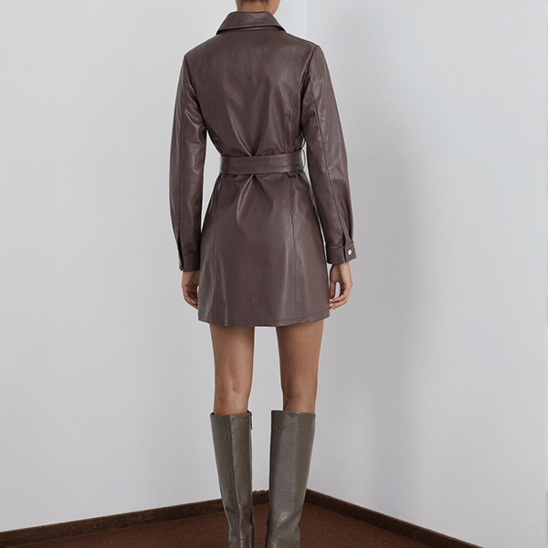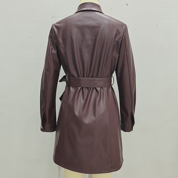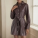 Fashion Stand Collar Long Sleeve Front Button Self-tie Artificial Leather PU Jacket
