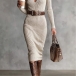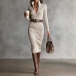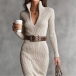 Fashion Stand Collar V-neck Long Sleeve Knitted Sweater Dress