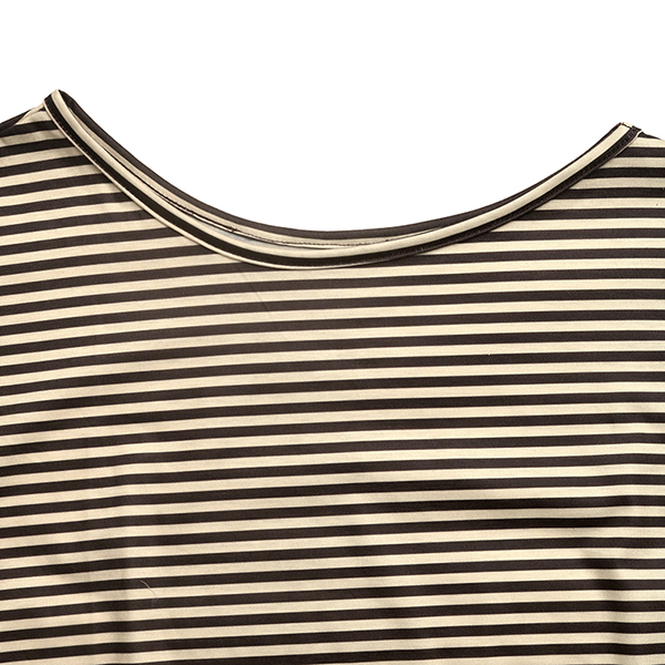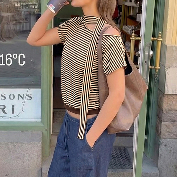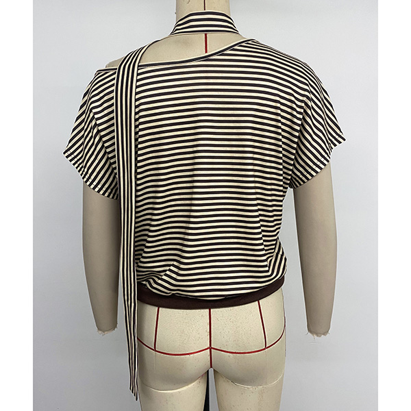 Fashion Stripe Printed Slant Shoulder Short Sleeve Shirt with Scarf