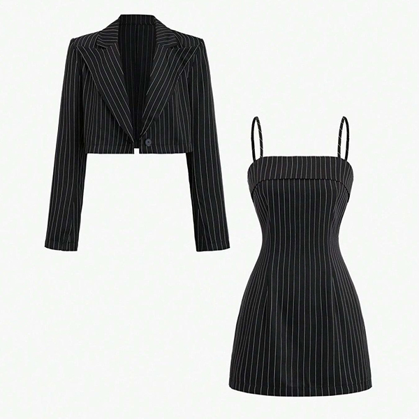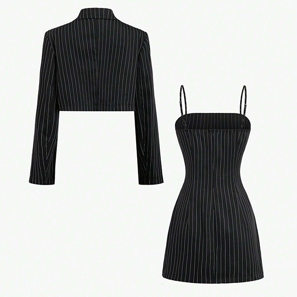 This coordinated two-piece set features structured crop blazer paired with figure-flattering bodycon dress in matching stripe print for contemporary professional sophistication.  Perfect for professional occasions, contemporary events, or sophisticated coordinated styling.