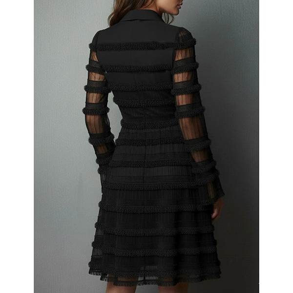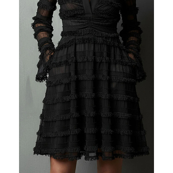 This black dress features dynamic tiered styling with sophisticated ruffle texture construction and elegant deep V-neck design for modern dimensional sophistication. Whilst the side pockets offer practical functionality and casual refinement. Wanna have a try?