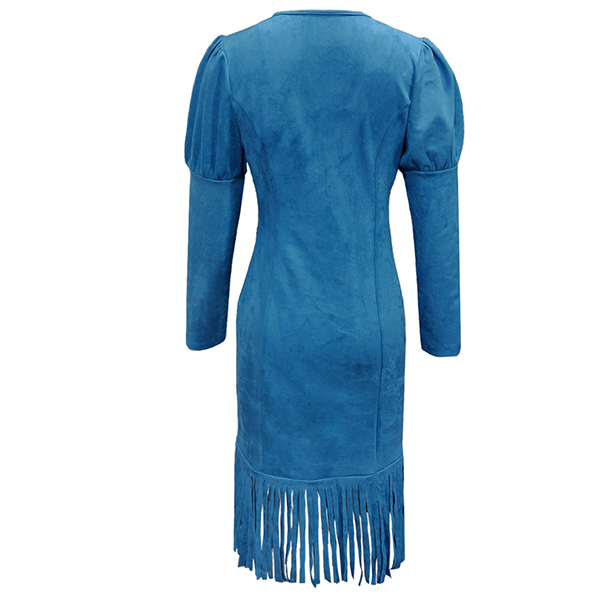 Fashion V-neck Puff Long Sleeve Fringe Hemline Faux Suede Bodycon Dress