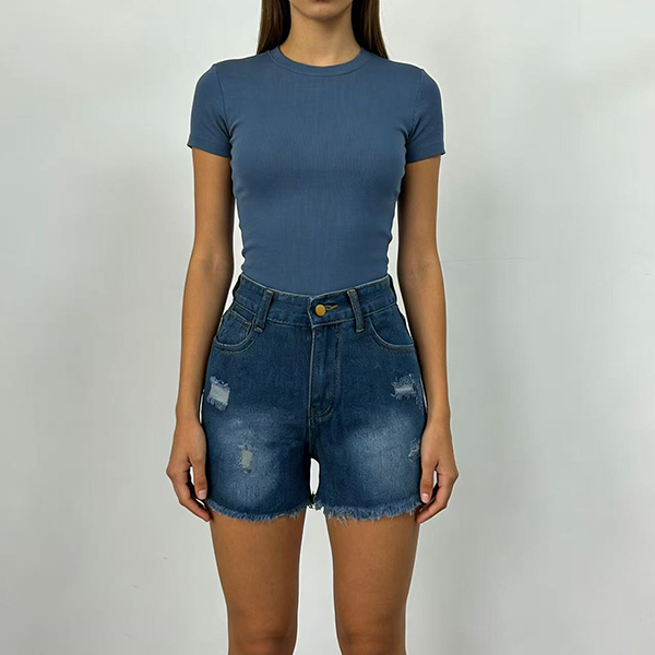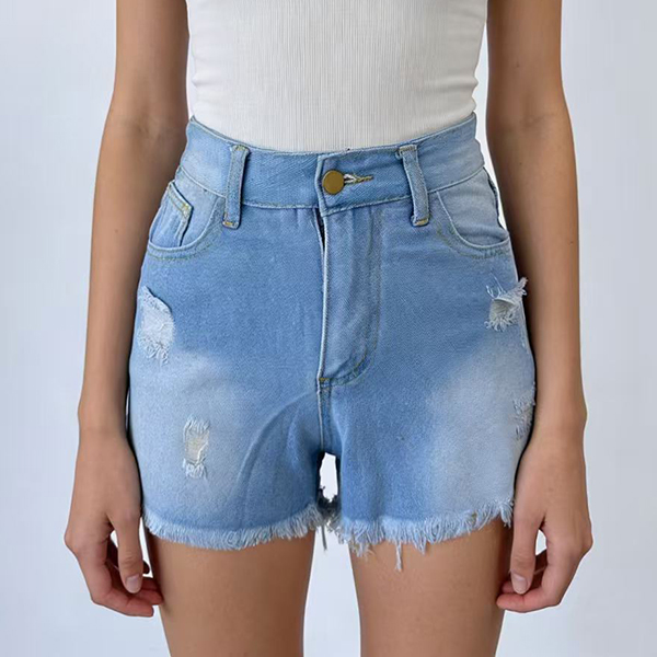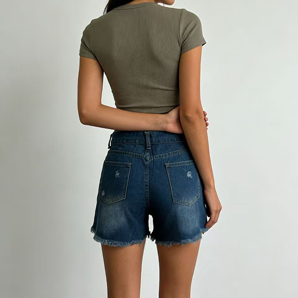 These denim shorts feature modern high-rise styling with edgy frayed hemline construction and authentic old-washed denim for fashion-forward casual elegance. Perfect for daily wear.