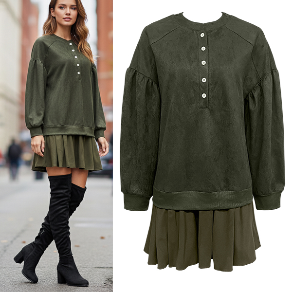 This is a chic and stylish sweatdress that combines classic elements with trendy details for a fashionable look. The front button detailing adds a touch of sophistication and elegance to the dress, creating a polished and timeless vibe. The crew neck design offers a classic and versatile neckline that suits a variety of styles and occasions. The ruffle spliced hemline adds a playful and feminine touch to the dress, creating movement and visual interest. Perfect for daily wear.