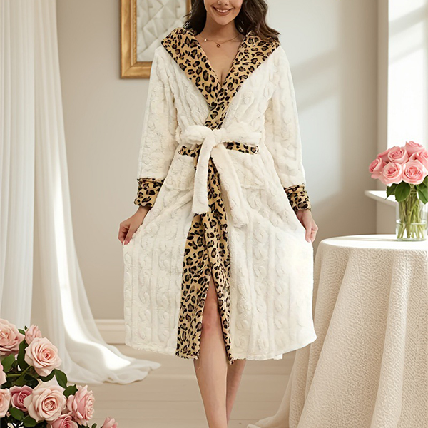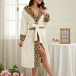 Comfy Warm Cable Pattern Leopard Printed Spliced Lapel Long Sleeve Self-tie Robe Pajamas